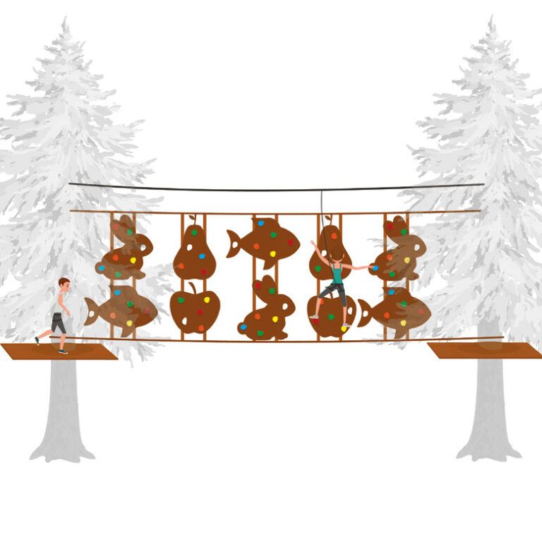 Installed on two wire ropes. The distance between the wire ropes can be customised. Made of larch (mélèze) wood. Board dimension: 20 cm x 250 cm. Number of climbing holders: 3 on each board.