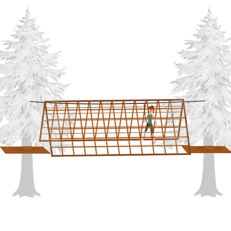 Installed on three wire ropes. The distance between the wire ropes can be customised. Mesh size: 25 cm or 30 cm. Rope diameter: 16 mm. Size of net: custom