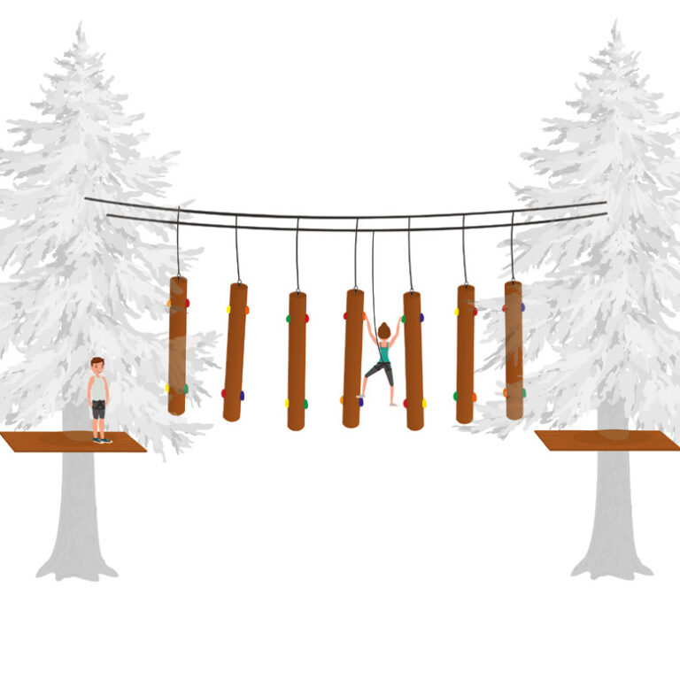 Installed on two wire ropes. Distance between the ropes is 60 cm. Slings are 200 cm long. Made of larch (mélèze) wood. Size of Z element: 75 cm x 150 cm.
