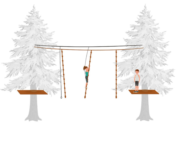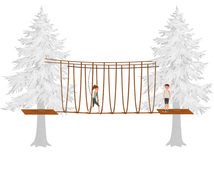 Installed on two wire ropes. Slings are 210 cm long. Sling rope diameter: 16 mm. Blue mamba rope diameter: 13 cm.