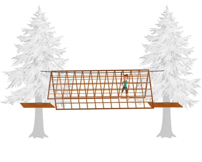Installed on two wire ropes. The distance between the wire ropes is 60 cm. Rope diameter: 16 mm. Full length: 60 cm